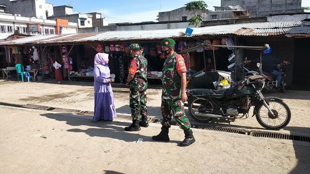 Batu Bara  |  Para pedagang dan pembeli merasa senang karna Babinsa selalu menghimbau untuk mematuhi protokoler kesehatan, himbauan untuk terapkan protokol kesehatan disampaikan oleh Personel Bintara Pembina Desa Koramil 02/Air Putih jajaran Kodim 0208/Asahan Serma Kardi dan Serma AL. Samosir turun langsung kewilayah binaan untuk melaksanakan Patroli Disiplin Mandiri Covid-19 yang dilaksanakan bertempat di Pajak Delima Indrapura dengan memberikan arahan dan himbauan kepada pedagang dan pengunjung agar selalu mentaati Protokoler Kesehatan dgn menggunakan masker untuk menghindari penularan/penyebaran virus Covid-19, kegiatan tersebut berposisi di Pajak Delima Indrapura Kecamatan Air Putih Kabupaten Batu Bara, Senin (30/05/2022).