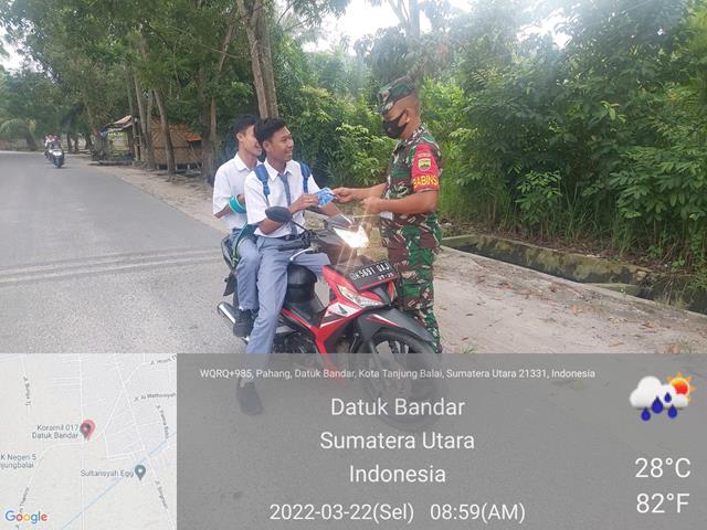 Tanjung Balai  |  Guna untuk memutus mata rantai penyebaran Virus Covid 19 di wilayah Binaan, kesadaran masyarakat terhadap protokol kesehatan dalam rangka memutus rantai penyebaran covid-19 masih harus ditingkatkan dan diingatkan. Hal ini menjadi tugas para aparat di kewilayahan untuk terus melaksanakan sosialisasi dan aksi nyata di lapangan. Seperti halnya apa yang dilakukan oleh Personel Bintara Pembina Desa (Babinsa) Koramil 17/Datuk Bandar jajaran Kodim 0208/Asahan Kopda Agus Nuryaddin turun kewilayah binaan untuk melaksanakan kegiatan memberikan himbauan serta membagikan Masker kepada Masyarakat yang akan berangkat Kerja dengan menghimbau selalu tetap menjaga Protokol Kesehatan Pencegahan Covid-19, kegiatan tersebut yang dilaksanakan bertempat di Jalan HM. Nur Lingkungan IV Kelurahan Pahang Kecamatan Datuk Bandar Kota Tanjung Balai, Selasa (22/03/2022).