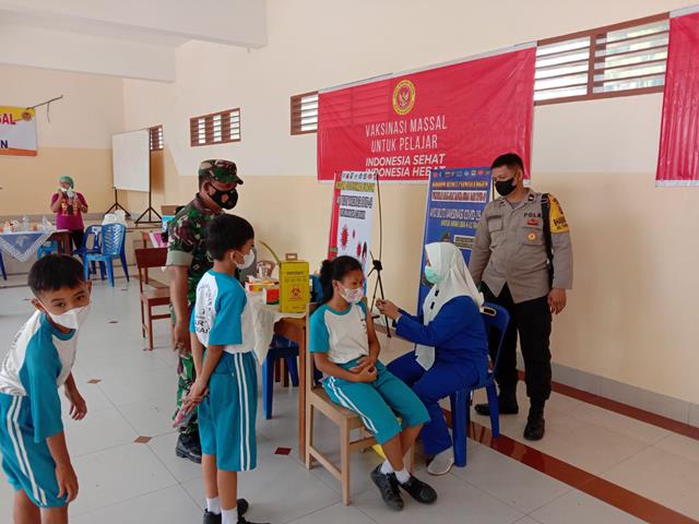 Pematang Siantar | Program Vaksinasi Covid-19 untuk anak-anak usia 6-11 tahun gencar terus dilakukan di seluruh daerah, dalam hal ini dengan tujuannya tentu bagaimana melindungi anak-anak dari wabah corona, sehingga dengan menerima vaksin, kekebalan tubuh mereka akan terbentuk dan bisa menangkal virus corona tersebut. Seperti halnya yang dilakukan oleh Personel Bintara Pembina Desa (Babinsa) Koramil 01/Siantar Utara jajaran Kodim 0207/Simalungun Serka HRP. Sihombing turun kewilayah binaan untuk melaksanakan kegiatan monitoring wilayah dalam rangka pendampingan pelaksanaan Vaksinasi Dosis-I (Jenis Sinovac) sebanyak 316 (tiga ratus enam belas) orang, untuk siswa/siswi SD RK-7, umur 6 s.d 11 tahun yang diselenggarakan oleh Dinas Kesehatan Pematangsiantar, kegiatan tersebut yang dilaksanakan bertempat di SD RK-7 Kelurahan Naga Piy Kecamatan Siantar Martoba Kota Pematang Siantar, Sabtu (08/01/2022).