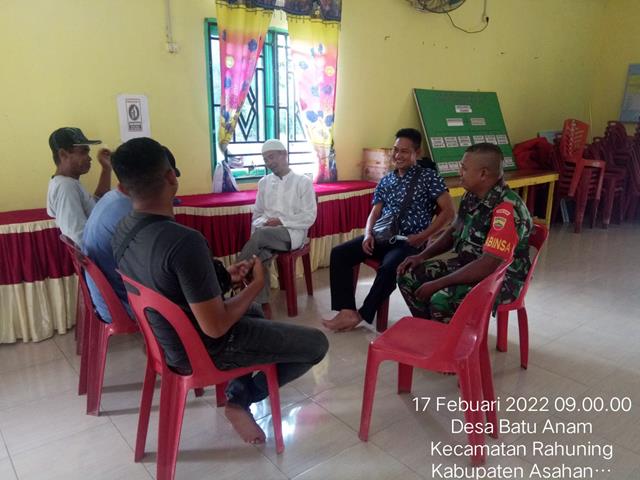 Asahan | Agar terciptanya hubungan keharmonisan serta mempererat hubungan sirahturahmi antara rakyat dengan TNI, serta dalam rangka membina silaturahmi dan wujud sinergitas antara perangkat desa dengan dinas terkait, Personel Bintara Pembina Desa (Babinsa) Koramil 15/Bandar Pulau jajaran Kodim 0208/Asahan Kopda Juliono turun kewilayah binaan untuk melaksanakan Komunikasi Sosial (Komsos) bersama perangkat desa dan masyarakat dalam rangka menjalin hubungan erat tali siratuhrami dan kerjasama yang baik dalam menunjang tugas pokok TNI serta untuk membicarakan tentang pelebaran jalan kepada masyarakat serta agar selalu menjaga kebersihan lingkungan dan selalu mematuhi protokol kesehatan agar terhindar dari Covid-19, kegiatan tersebut yang dilaksanakan bertempat di Dusun 1 Desa Batu Anam Kecamatan Rahuning Kabupaten Asahan, Kamis (17/02/2022).